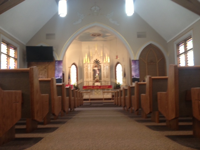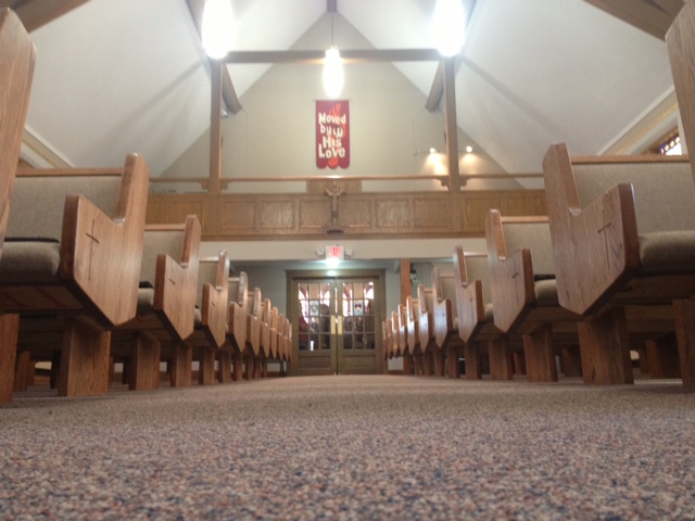 The sanctuary has a center aisle, and the pews hold hymnals for the congregation. Here you can see a good view of the sanctuary.