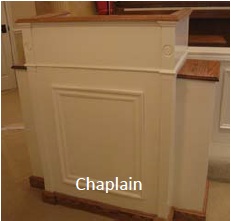 With similar Federalist style woodworking as the Bishop, the Chaplain is the most solid looking because of its large stature. With sides flanked, the Chaplain has a large footprint and is suited for churches with a larger area designated for a pulpit. When finished in Colonial white, this pulpit harkens back to traditional New England churches. An all stained look also looks beautiful in less formal settings and highlights the solid wood grain.