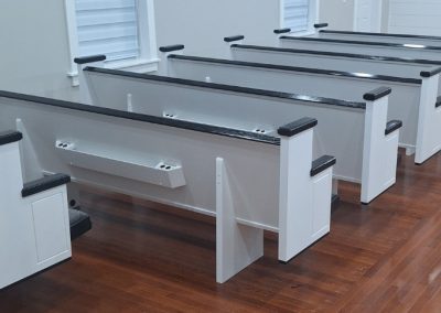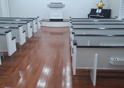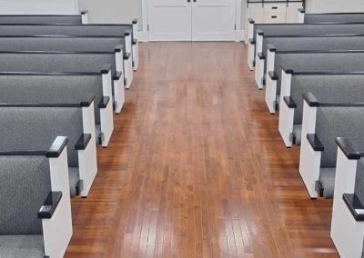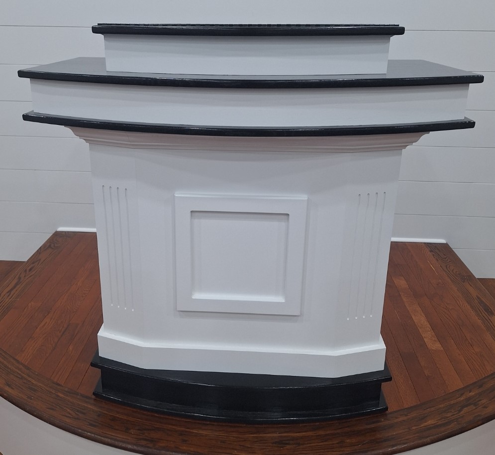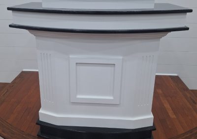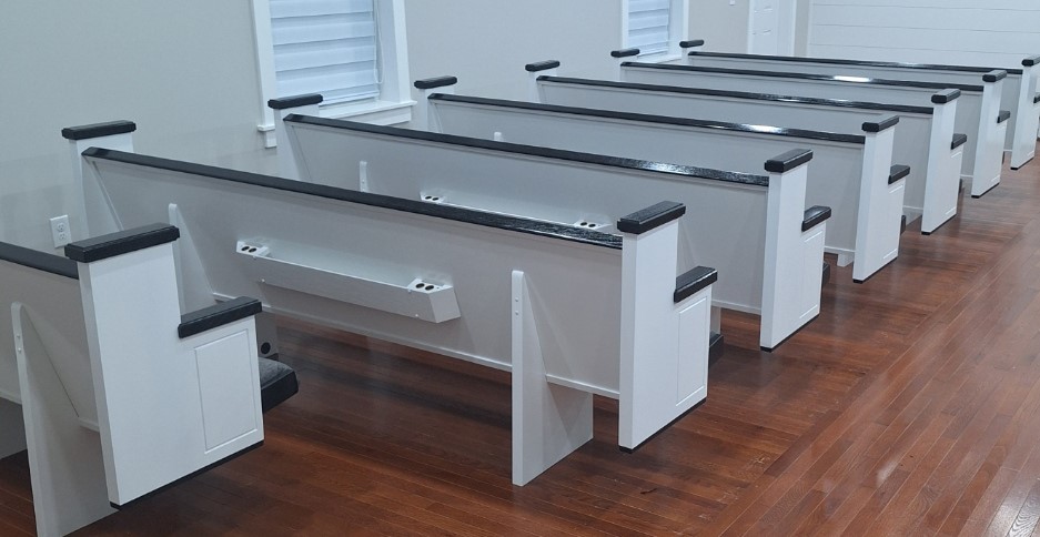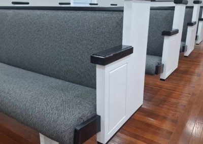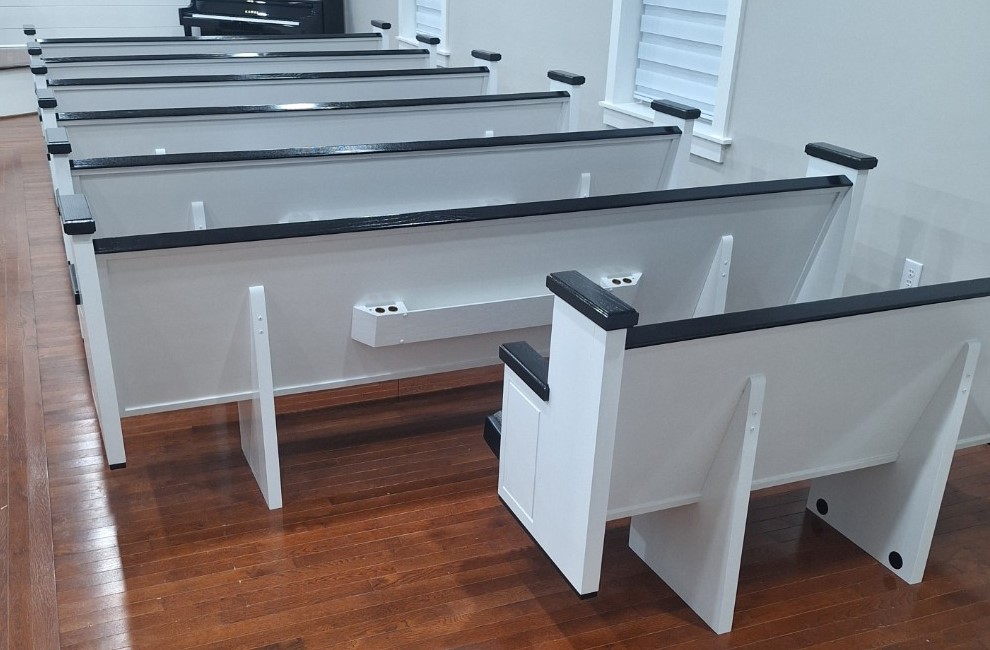 We were deeply honored when Pilgrim Baptist Church entrusted us with crafting their furniture. For them, we meticulously fashioned 14 of our renowned signature series 3003 pews, spanning from 5 to 8 feet in length and adorned in Black Marble fabric, complete with standard bookracks. Additionally, we crafted a bespoke pulpit with a gracefully curved front, harmonizing seamlessly with the curvature of their stage. The entire ensemble was finished in an exquisite colonial white hue, accented with sleek black details. We invite you to peruse the accompanying photos to witness the stunning outcome of this color palette.