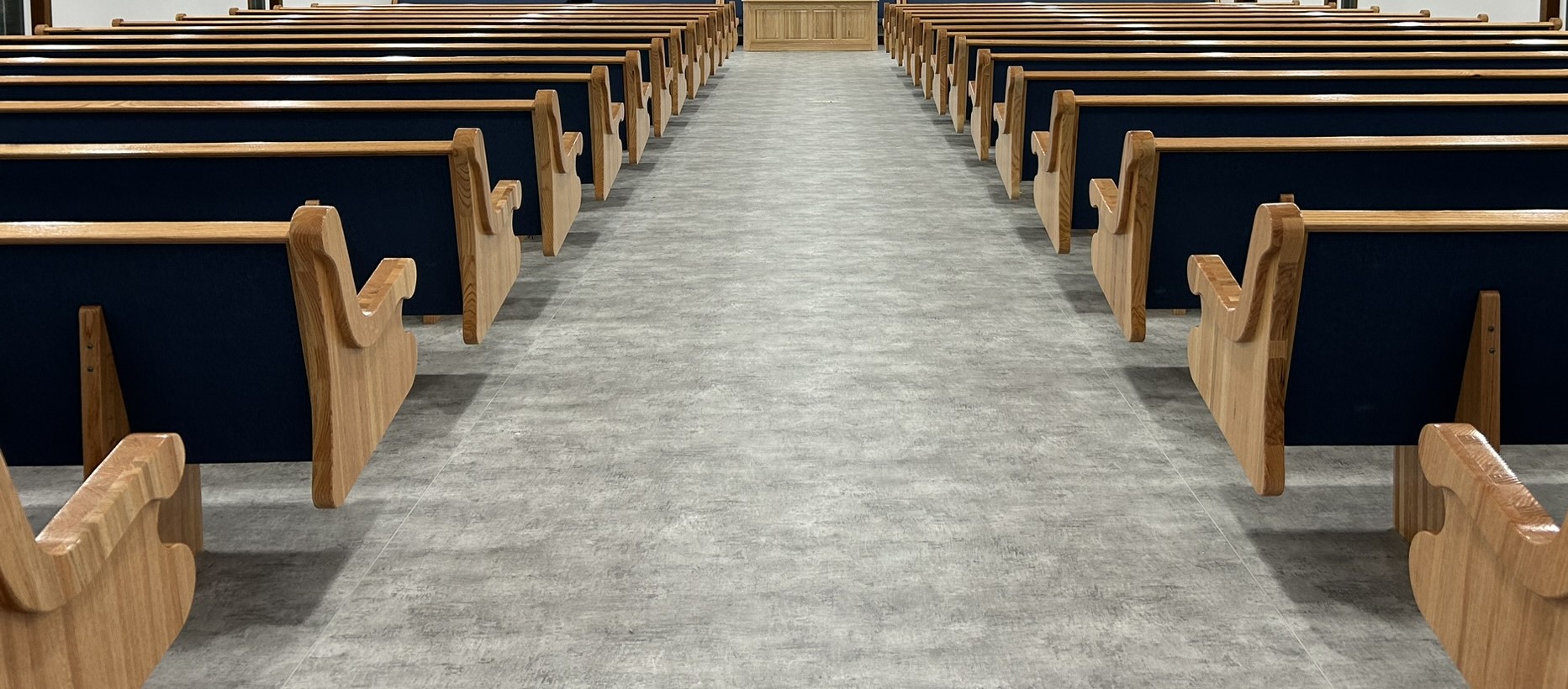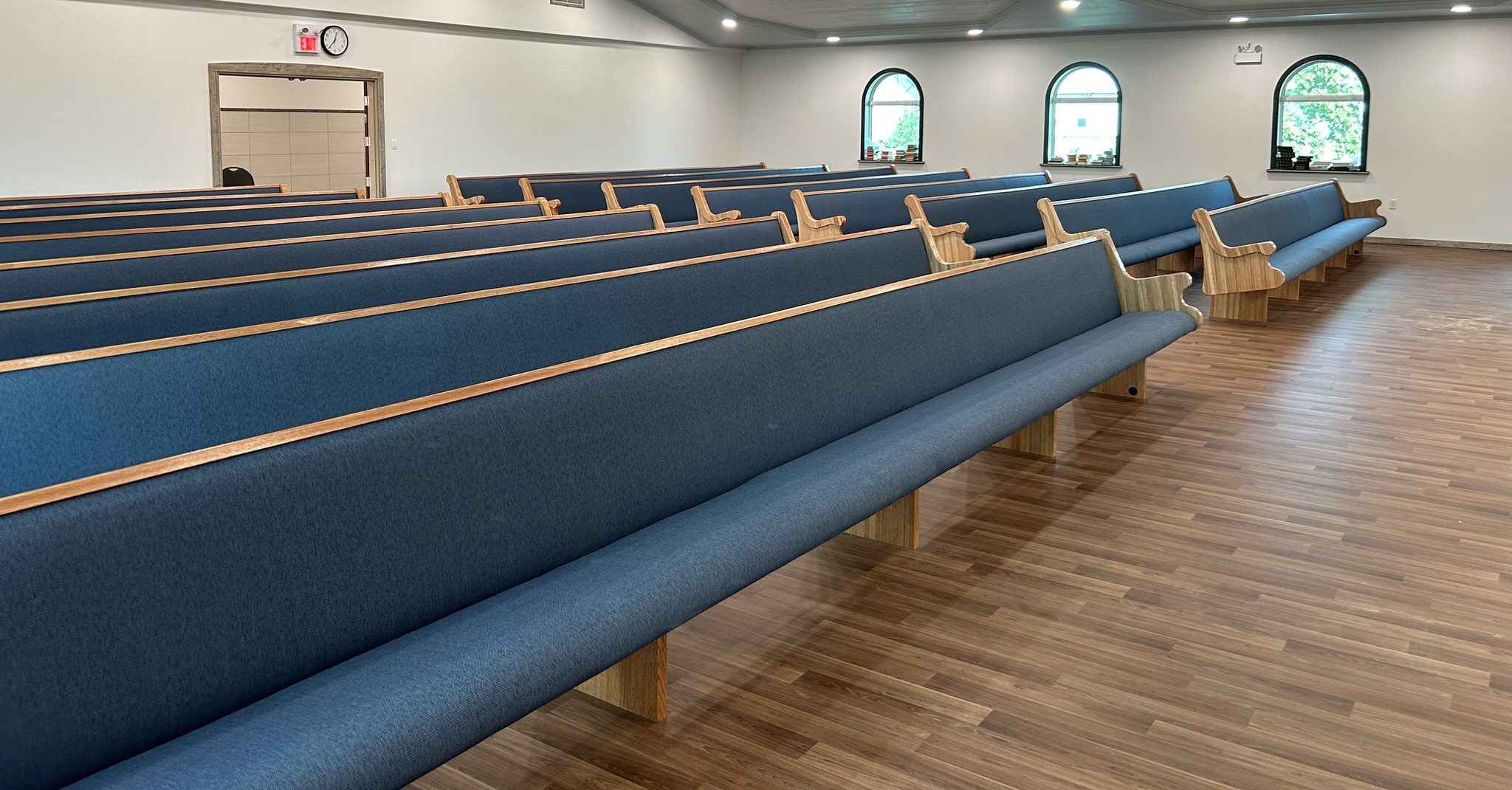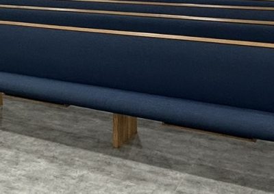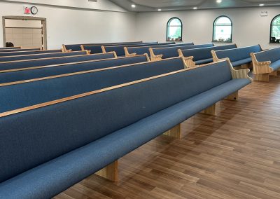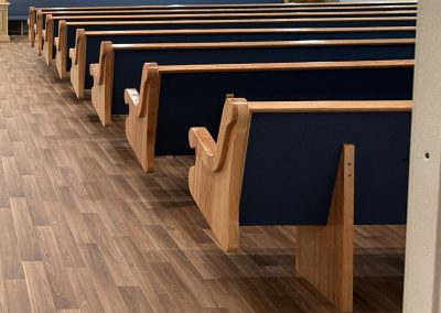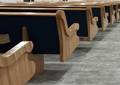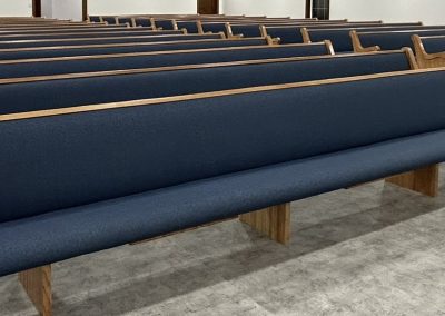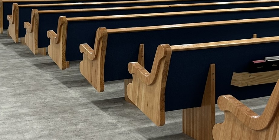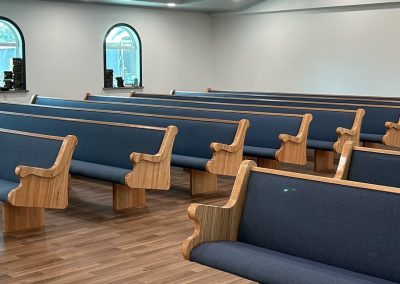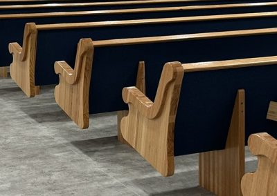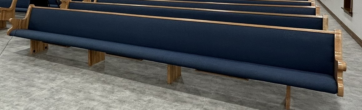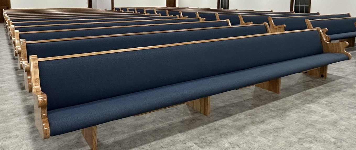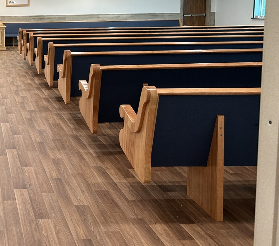 With the Argyle installation complete, they headed to their final stop at the Clear Water Colony in Winnipeg, Manitoba, Canada, where they installed 19 more pews of the same style, fabric, and stain.