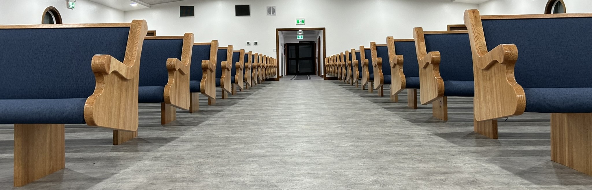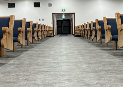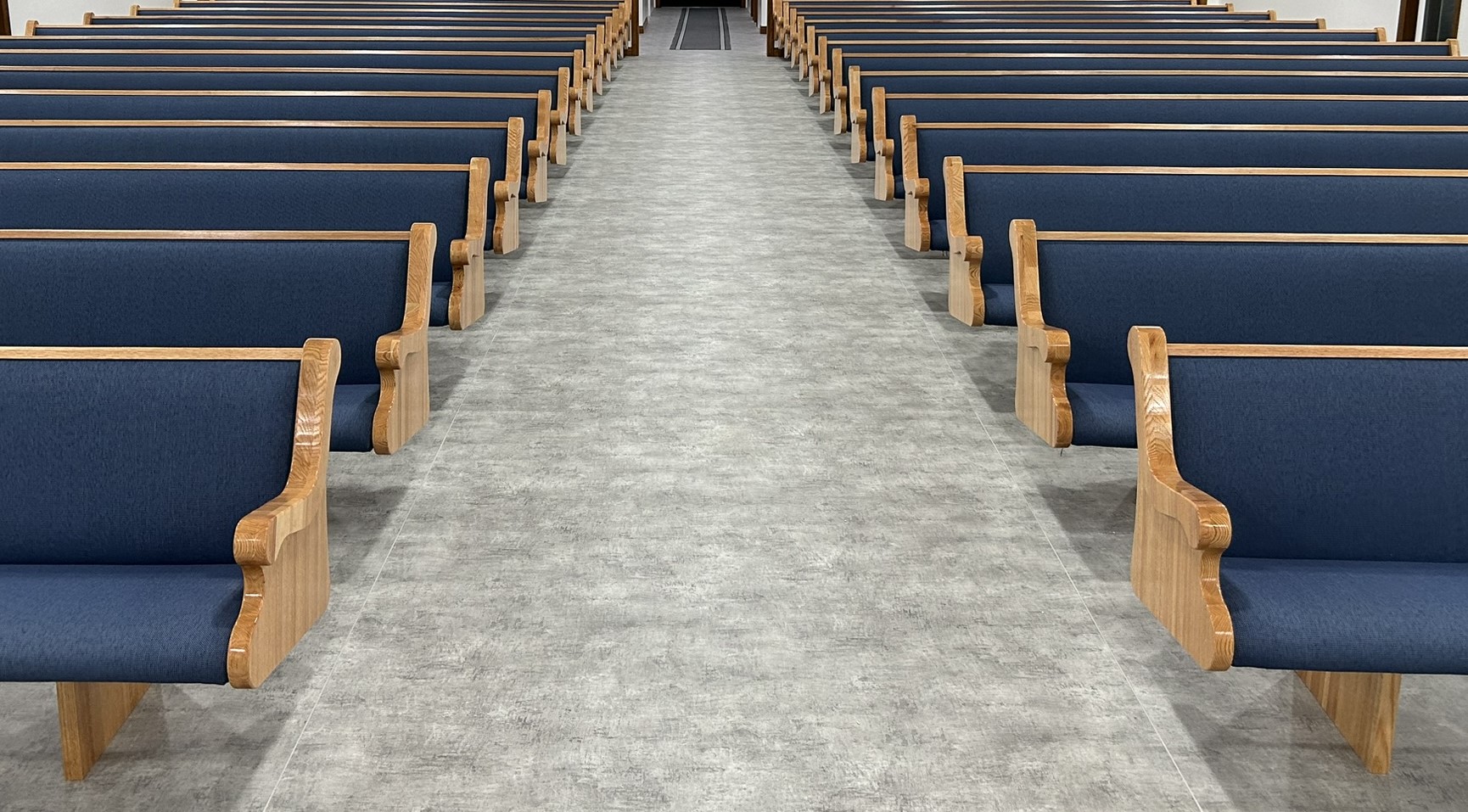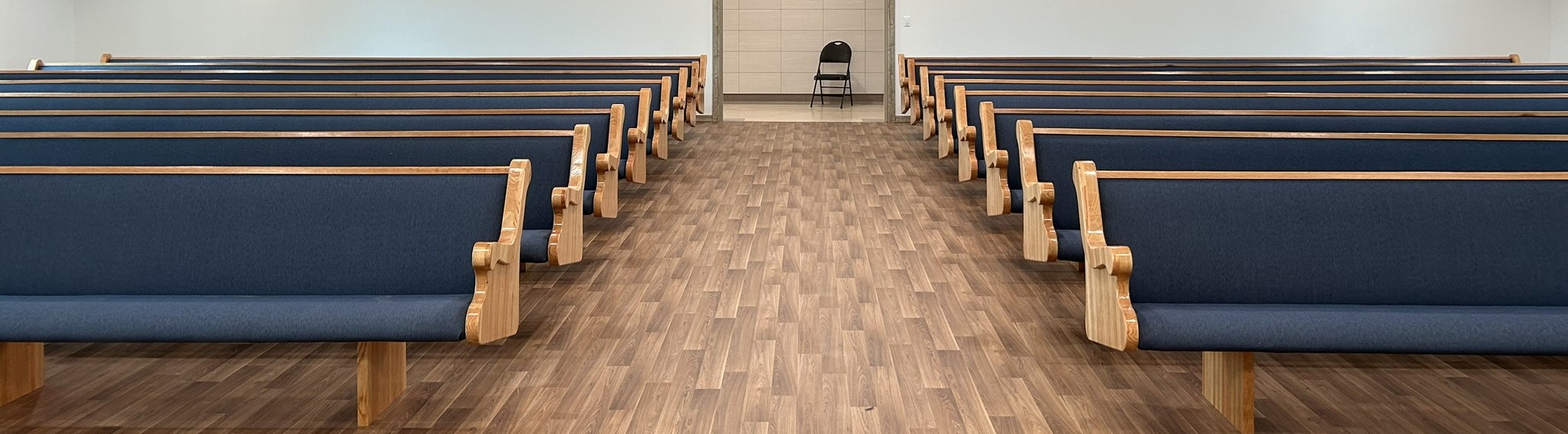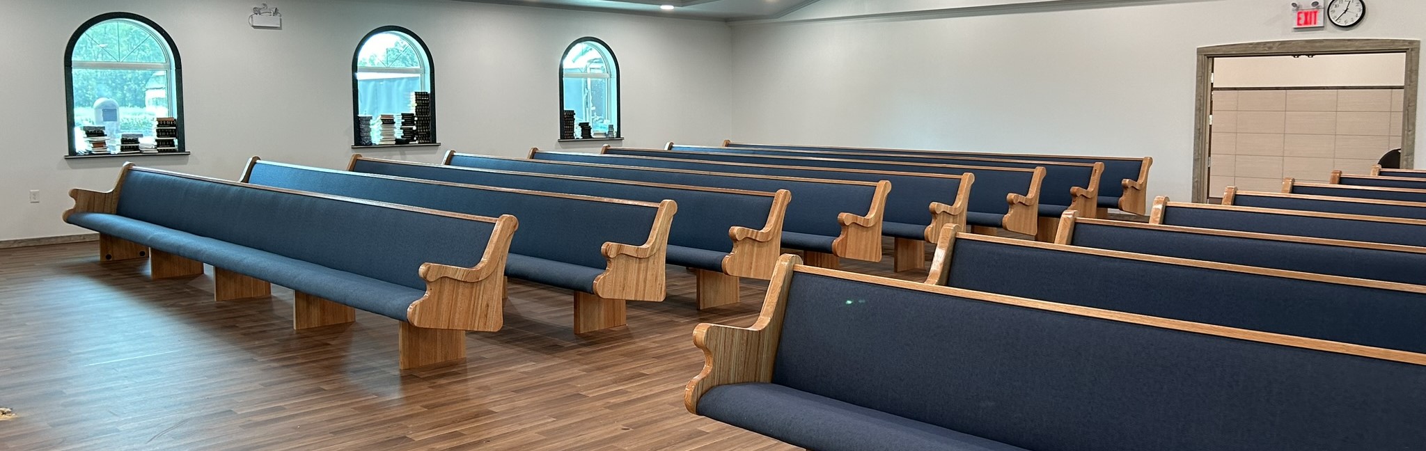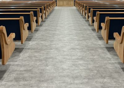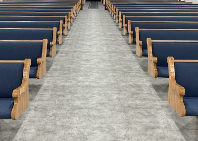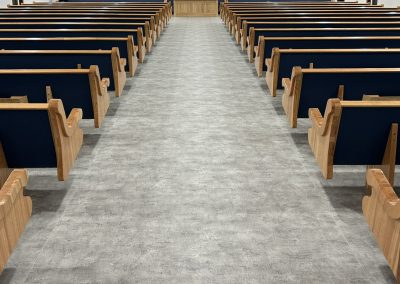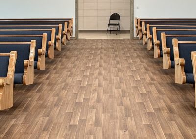 With the Argyle installation complete, they headed to their final stop at the Clear Water Colony in Winnipeg, Manitoba, Canada, where they installed 19 more pews of the same style, fabric, and stain.