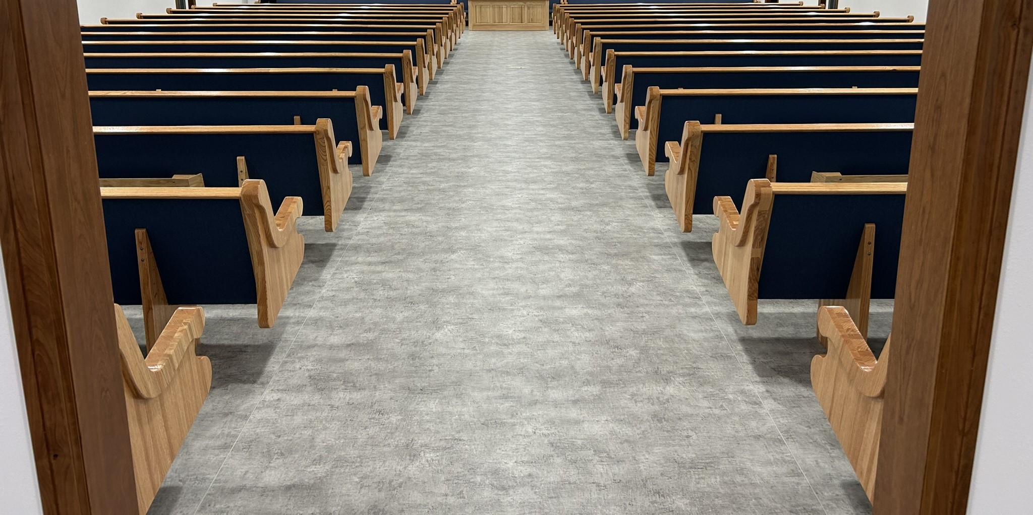 After resolving some delays and paperwork issues at the Canadian border, they proceeded to the New Haven Colony in Argyle, Manitoba, Canada. There, they installed 33 of our style 3001 pews, fully upholstered in Shire Chesapeake fabric and beautifully stained in Golden Pecan.