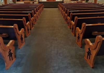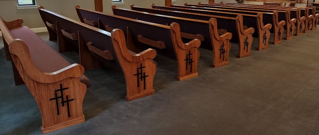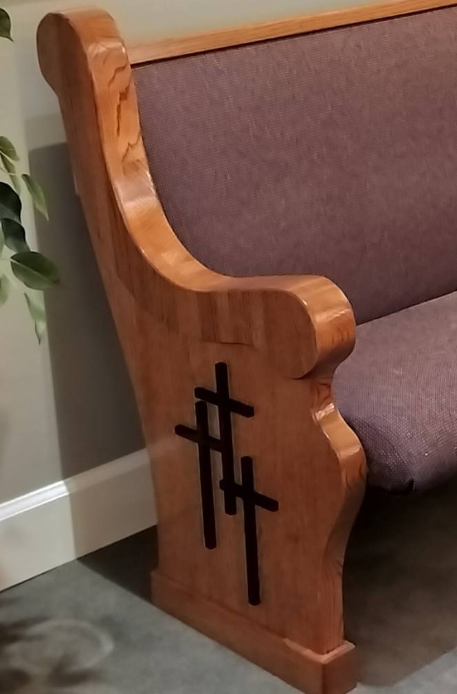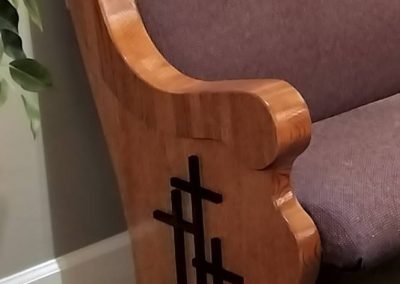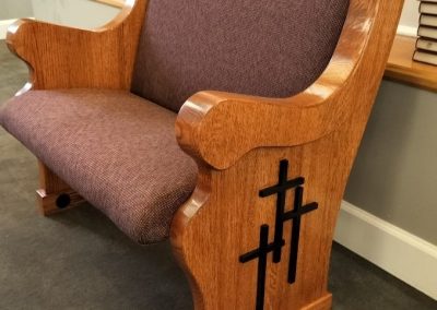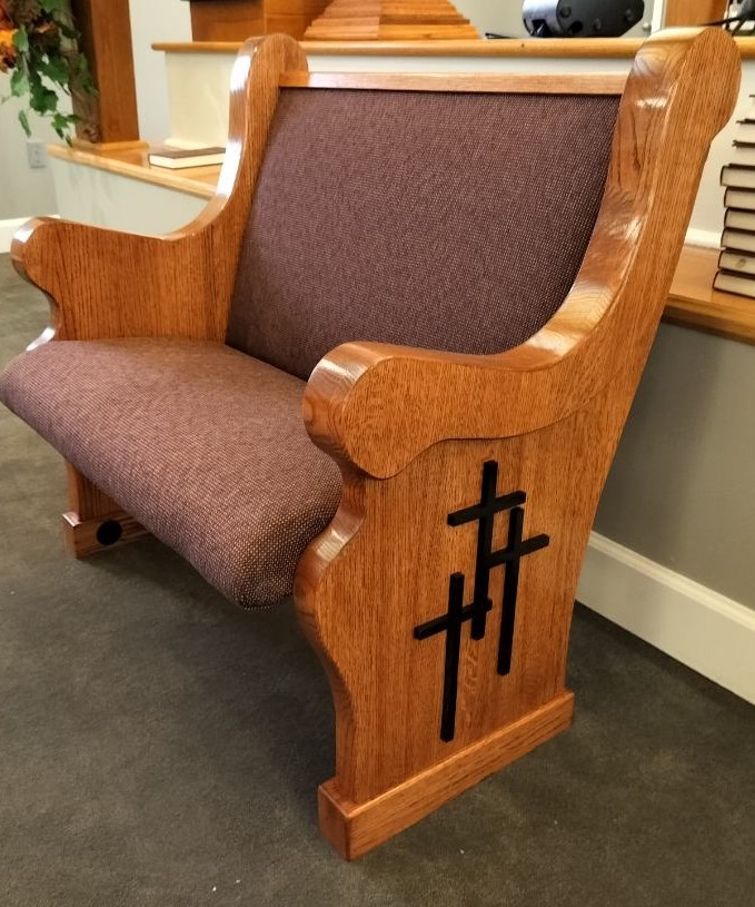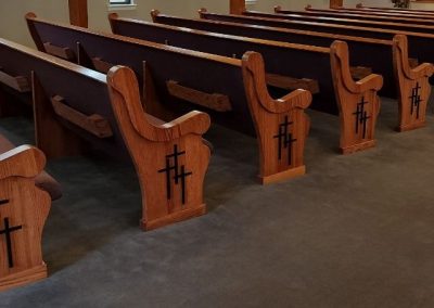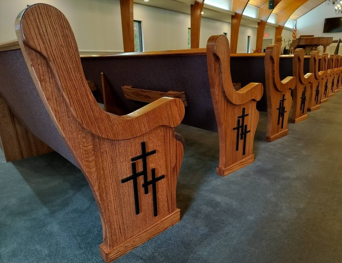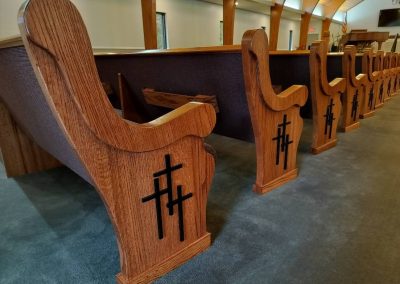 Each pew includes a custom-designed triple cross appliqué on the ends, along with convenient bookracks, creating a truly stunning and personalized worship space, as you can see from the photos.