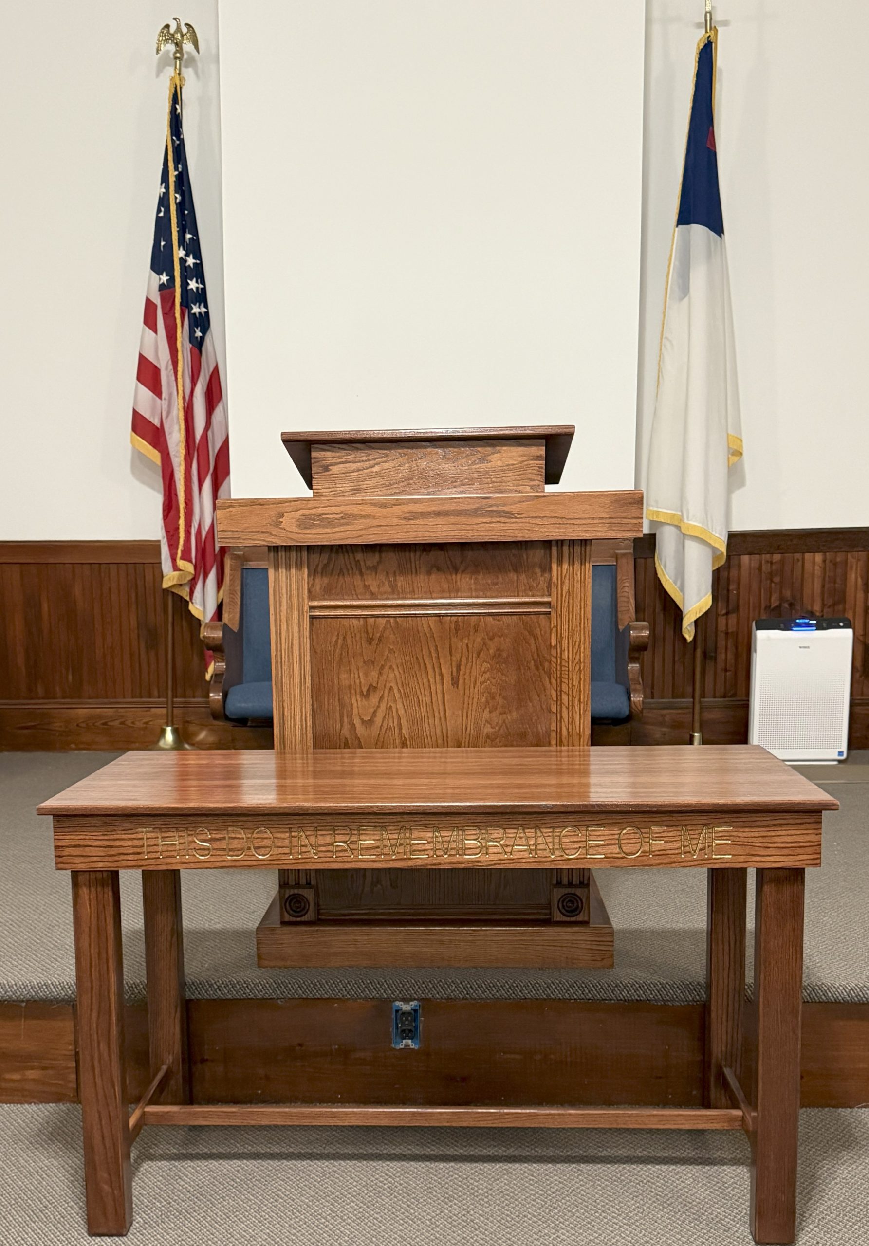 In addition to the pews, we delivered a matching Style 8050 pulpit, a 7005-communion table, and 21 choir chairs to fully outfit the sanctuary.