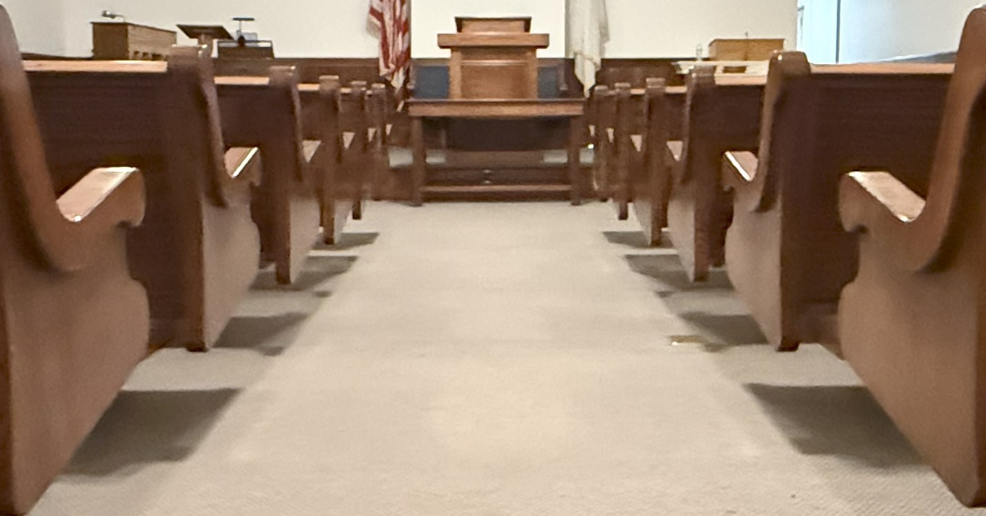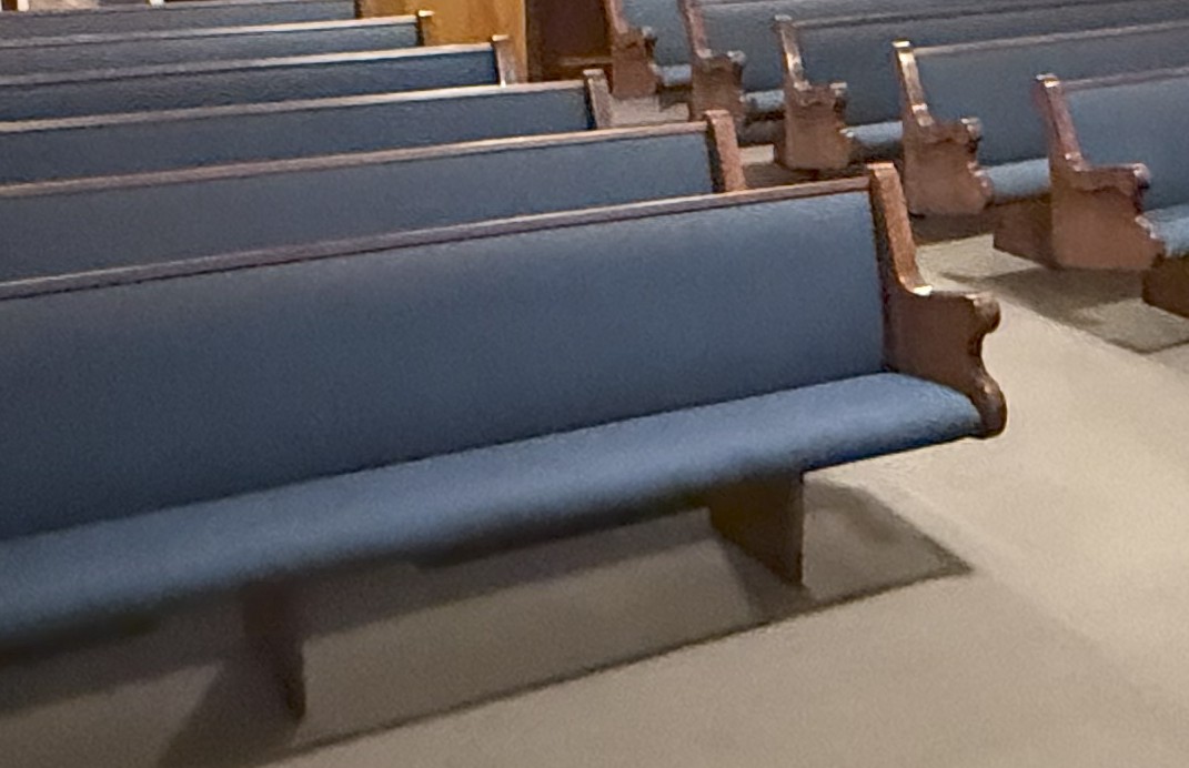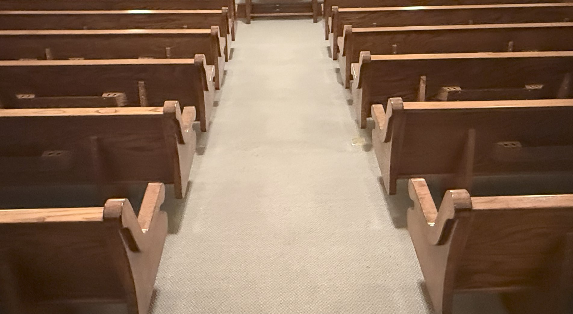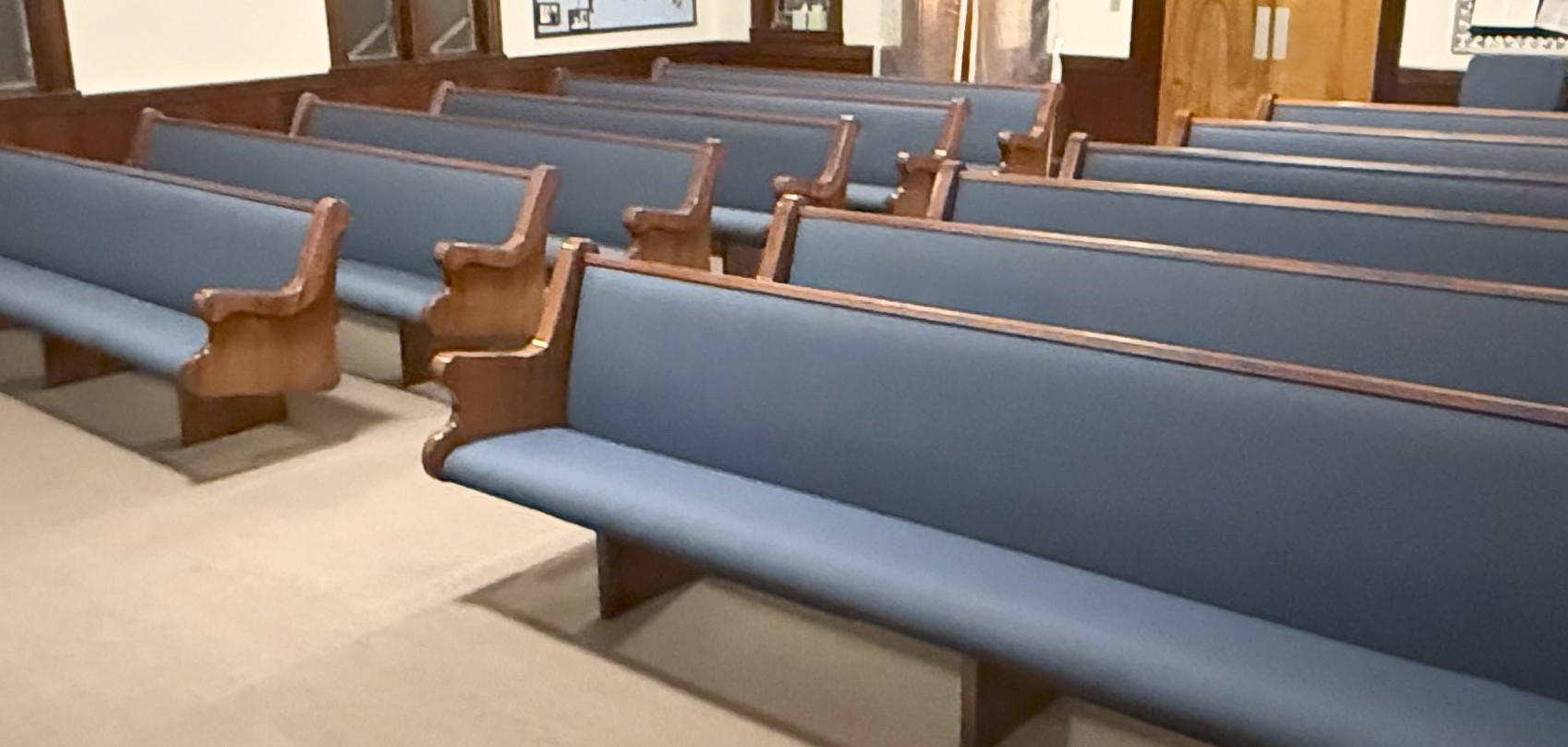 Each pew featured durable oak backs, standard book racks with communion cup holders, and was finished in a rich Carrington stain.