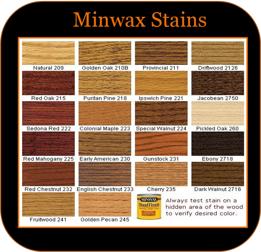 Colonial White, Natural, Golden Oak, Provincial, Driftwood, Red Oak, Puritan Pine, Ipswich Pine, Jocobean, Sedona Red, Colonial Maple, Special Walnut, Pickled Oak, Red Mahogany, Early American, Gunstock, Ebony, Red Chestnut, English Chestnut, Cherry, Dark Walnut, Fruitwood, Golden Pecan